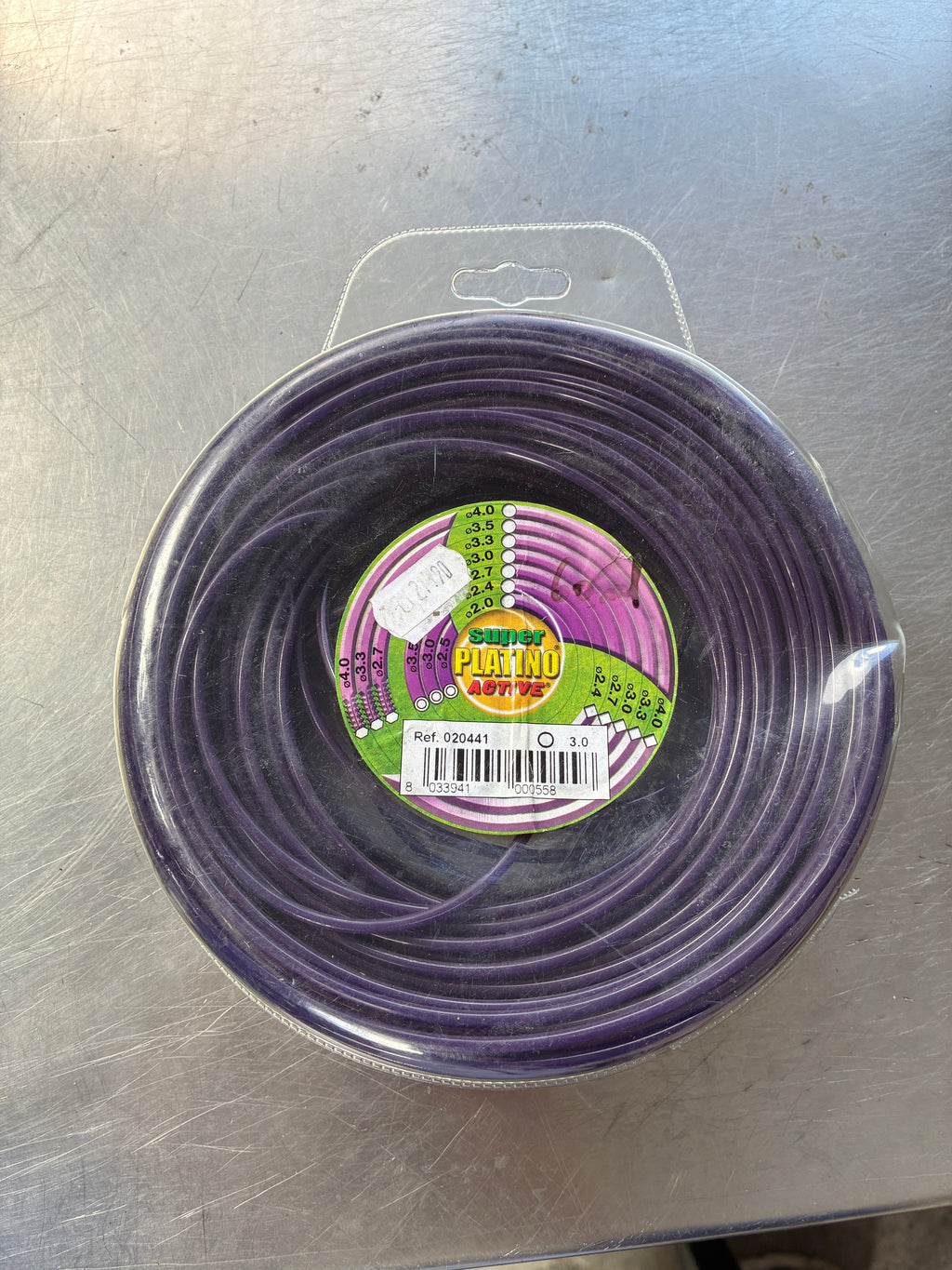 Fil de coupe Active Platino à section ronde, diamètre 3,0 mm, longueur d’environ 67 mètres. Conçu pour les travaux de tonte et de débroussaillage, il offre une bonne durabilité et une coupe nette.